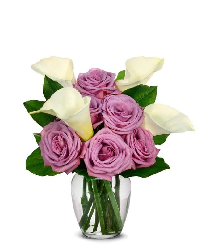 -21%The color purple represents?race, charm and elegance. Capture it all in this lovely display of purple roses, set along side the majestic white calla lily flower. Popular for it’s color and?ymbolic meaning, this bouquet is perfect for celebrating with those special in your life! A top choice among From You Flowers customers.
